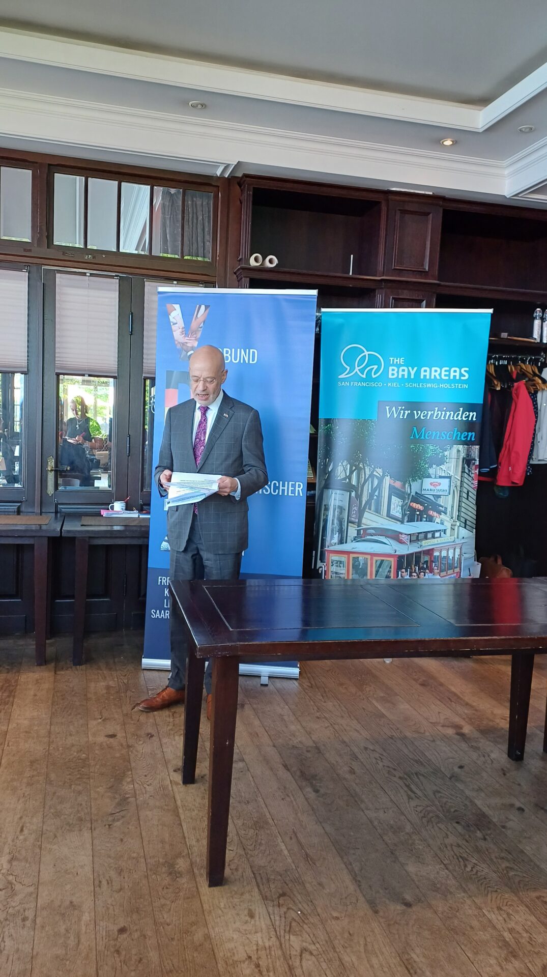 Nach Grußworten, unter anderem von Chargé d’Affaires Alan Meltzer (US-Botschaft Berlin) und der Ersten Stellvertretenden Stadtpräsidentin der Stadt Kiel, Constance Prange, entwickelte sich ein lebhafter Austausch der anwesenden Vertreter:innen aus Politik, Bildung und Kultur.